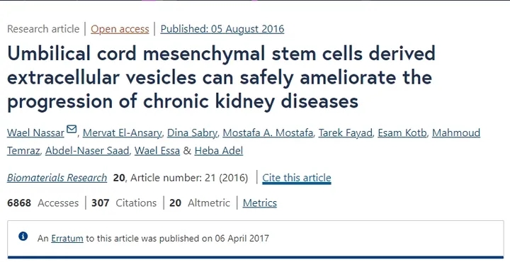 2016年,韦尔等人在一项临床研究中,通过放置在肾动脉中的导管将源自脐带间充质细胞的细胞外囊泡直接注射到肾脏中被证明是安全的,并且可以降低慢性肾病患者的免疫反应、尿素和肌酐水平。总共招募了40名患者,在本例中,进行了同时静脉内和动脉内注射EV。