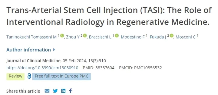 近期,国际期刊《Journal of Clinical Medicine》杂志发表了一篇《经动脉干细胞注射(TASI):介入放射学在再生医学中的作用》的文献综述。在这篇综述中,我们分析了不同的干细胞治疗概念以及介入放射学当前和未来的作用,重点是经动脉输送。
