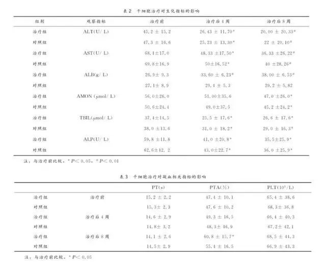 案例二:项人脐带血间充质干细胞移植治疗失代偿期肝硬化45例中,进行了干细胞治疗+基础治疗,观察患者移植后第0、4、8周的临床疗效及术后的不良反应。治疗组和对照组乏力、纳差、尿少、水肿症状在第1~2周即明显缓解,腹胀明显减轻,2~8周症状持续缓解。治疗组8周后肝功能合成指标(ALB、PTA)较治疗前均有显著改善,而对照组治疗前后比较则无显著性差异。